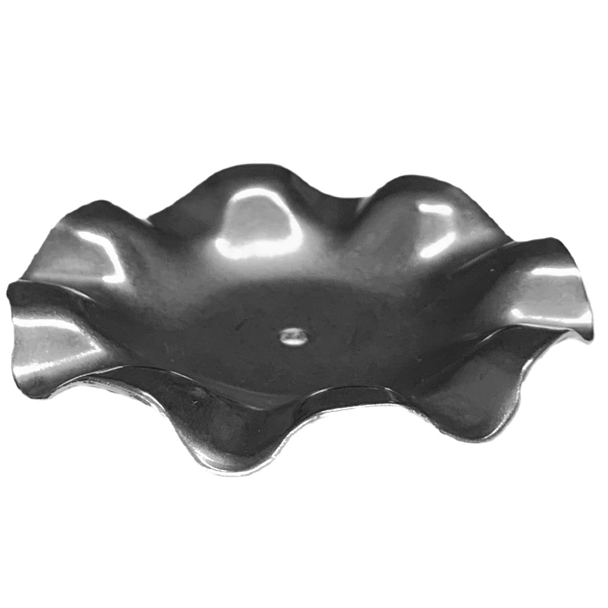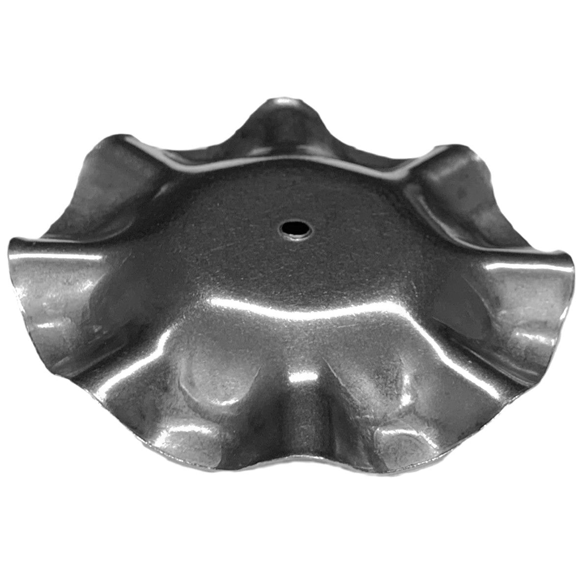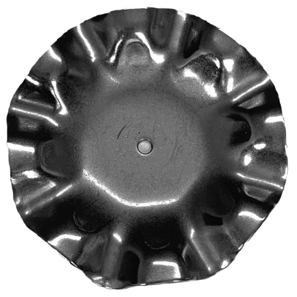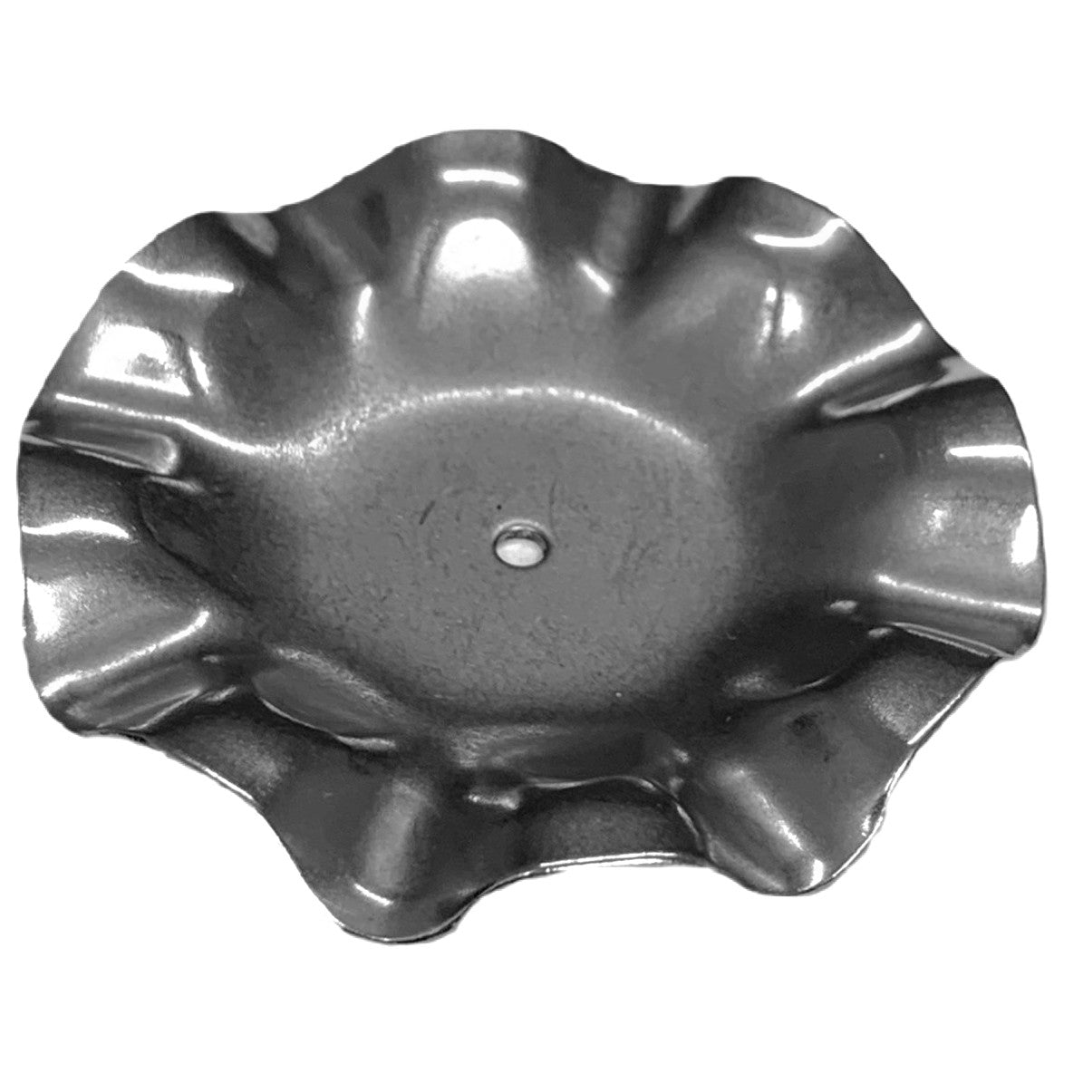A silver candle plate made from steel with frilled edges.