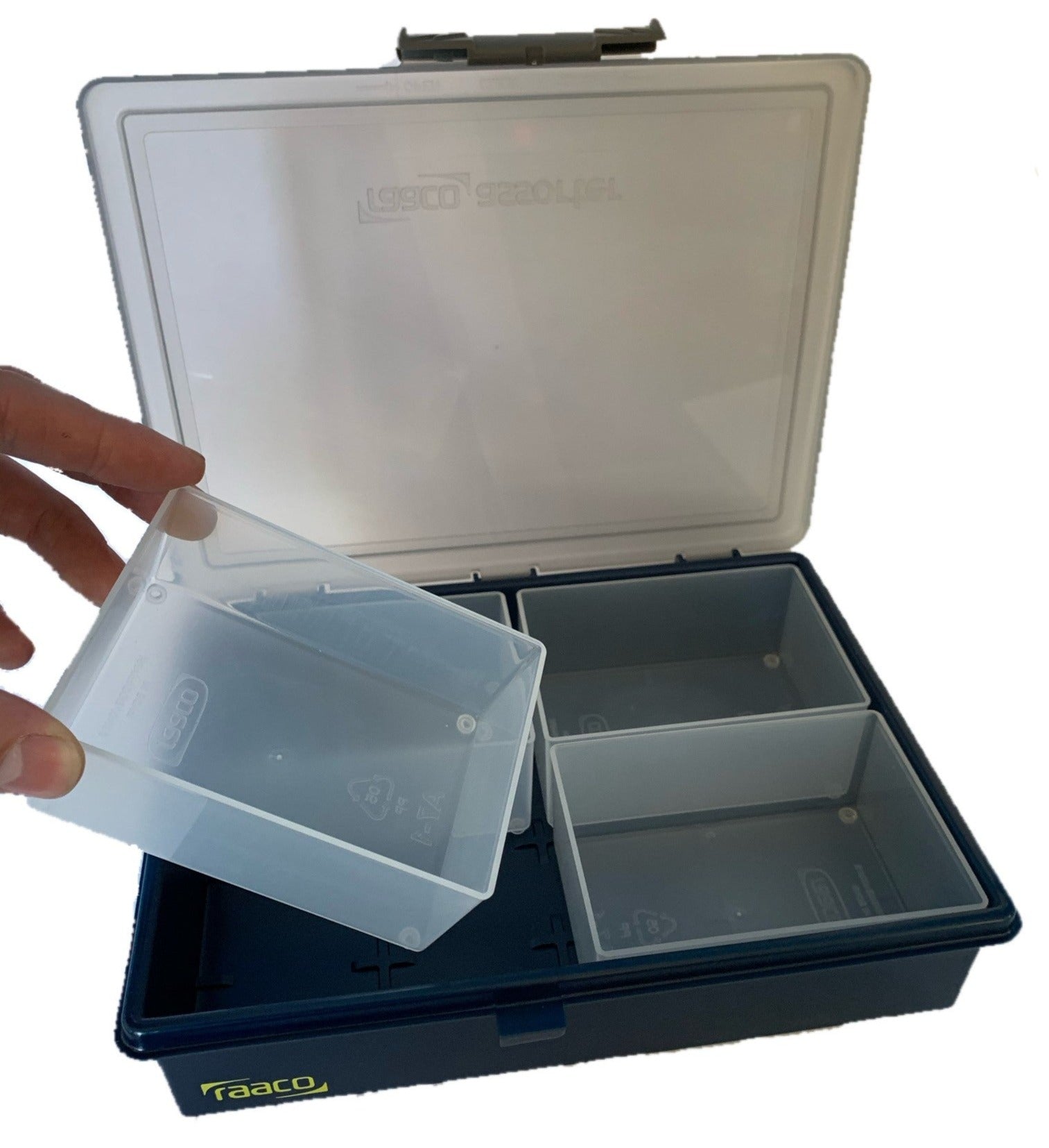 Our Small Organiser Box is the ideal way to keep nuts and bolts, rivets, allen keys and small components close at hand. With 4 removable inner trays, you can also use the empty box as a safe place to keep your operating instructions, spare parts drawings etc.